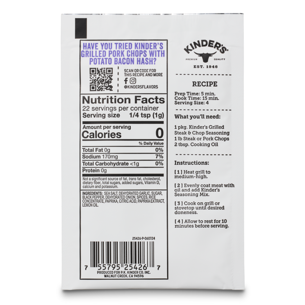 Kinder's all new Grilled Steak and Chop Seasoning is our signature blend for the grill that adds a touch of bold flavor while allowing quality meat to remain the star of the show. It is a rich blend of cracked black pepper, garlic, onion, lemon, parsley and herbs that works well with just about everything. Like the name says, you can throw it on grilled steaks and pork chops, but don’t be afraid to try it on grilled chicken or even veggies. This one is an all-around standout for any grilling occasion. We can't wait for you to try it.